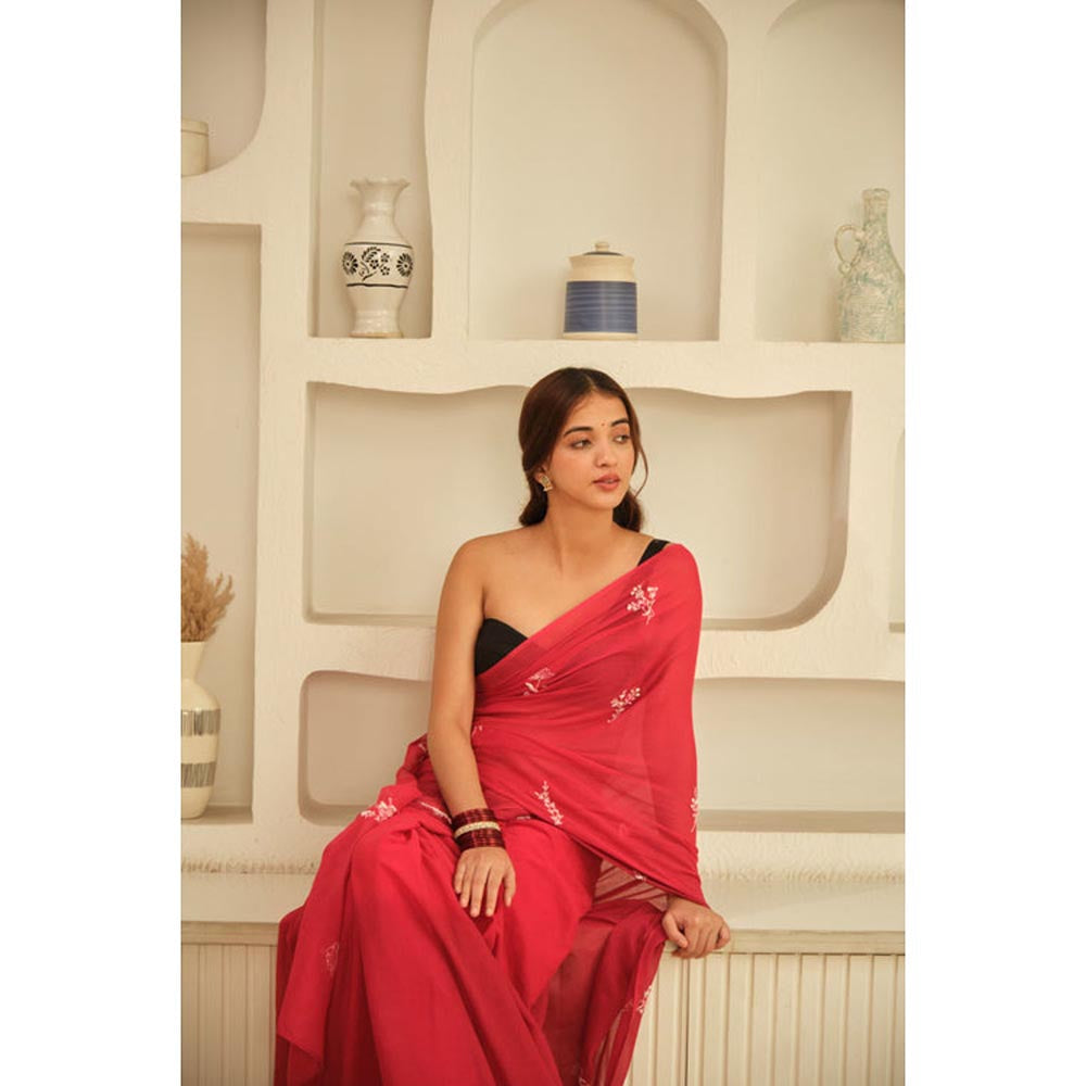 Women Floral Red Hand Embroidered Cotton Saree