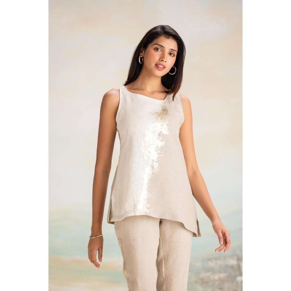 Description : 100% Linen Top Length 26a / Model Height 5'9" A Relaxed, Sleeveless Top With An Asymmetrical Design, Offering A Stylish And Comfortable Fit. The Distinctive Cut Adds A Contemporary Touch, Making It Ideal For Layering Or Wearing Solo For A Chic, Laid-Back Look. Handcrafted With Layered Appliques Featuring A Scenic Tapestry Of Delicate Leaves And Blossoms Meticulously Crafted From Hand-Cut Organza And Linen, Creating A Beautiful Interplay Of Textures And Depth, Accompanied By A Breathtaking View Of The Lush Greenery And Cascading Waterfalls That Ebbs And Flows In Stunning Cotton Thread Embroidery. Comfort Fit Dry Clean Only