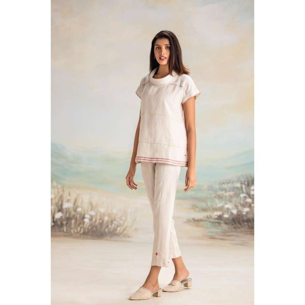 Description : 100% Linen Top Length 26'' / Pant Length - 36" / Model Height 5'9" A Linen Round Roll-Collared Top With Unique Overlocked Seam Lines In Contrast Colours, Adding Perfect Design Detail To The Garment. Paired Effortlessly With Our Signature Cigarette Pants. Relaxed Fit Mild Machine Wash