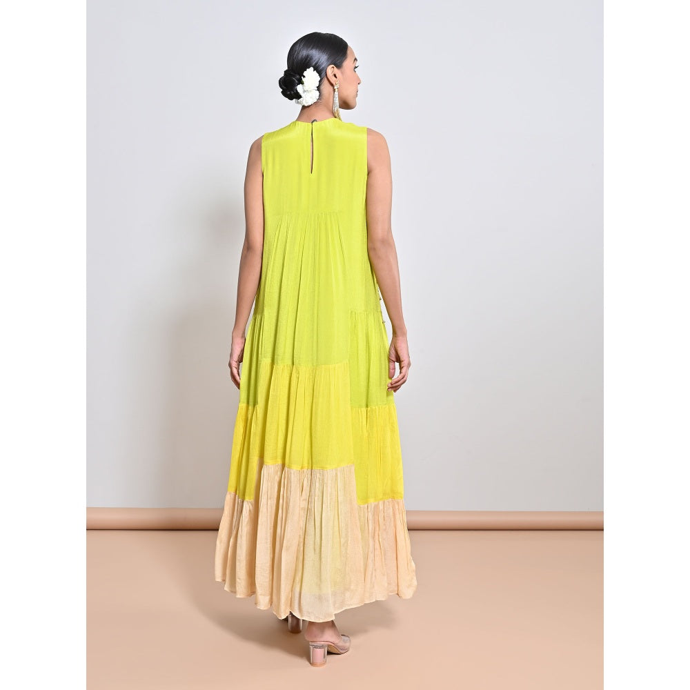 Description : Chiffon crepe tier dress embroidered with ivory/ gold flower motifs. It has a sleeveless design and round neck.