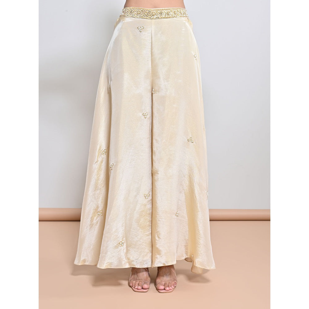 Description : Ivory bead/ sequins embroidered cutwork organza flower motifs silk tissue tunic paired with an embroidered motif flare silk tissue palazzo.