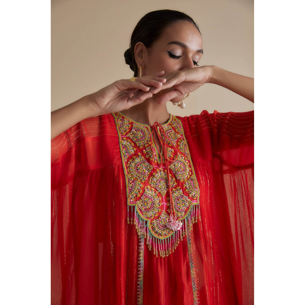 Description : Add a touch of elegance to your wardrobe with this red tunic & sharara by KEITH GOMES. Made from high-quality blended fabric. It features embellished & sequined pattern with three fourth sleeves, keyhole neck style, finished with a flared mid waist bottom style. Style it with an elegant matching jewelry and heels to complete the ensemble.