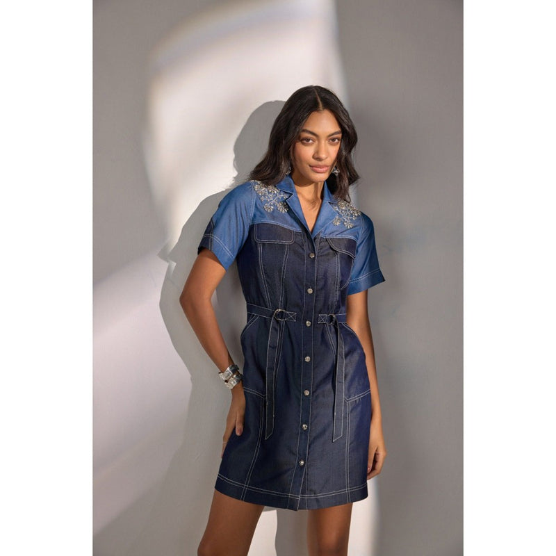 Description : Dress : Short Dress In A Relaxed Fit Half Sleeve Stop-Stitch + Colour Block Details All Over Lapel Collar Front Opening Silver Metal Buttons & Fastenings Crystal Details On Pockets Fabric : Butter Soft Denim-Effect Fabric Wash Care Instructions: Dry Clean Only Model's Height: 5'8'