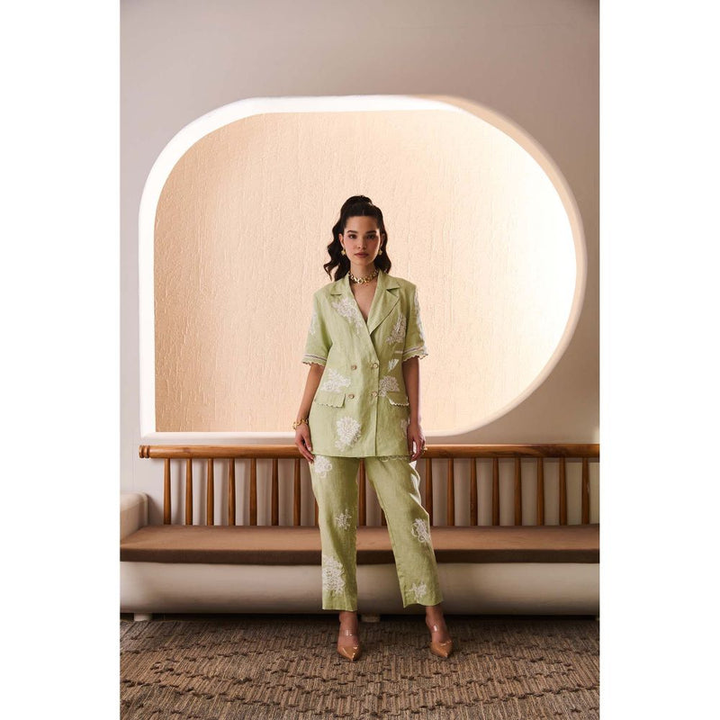 Description : Own your style with this green co-ord set from Label Deepika Nagpal. Made from high quality cotton linen, it features button fly closure and embroidered pattern along with half sleeves & notched lapel design. Pair it with heels and minimal jewellery to complete your ensemble.