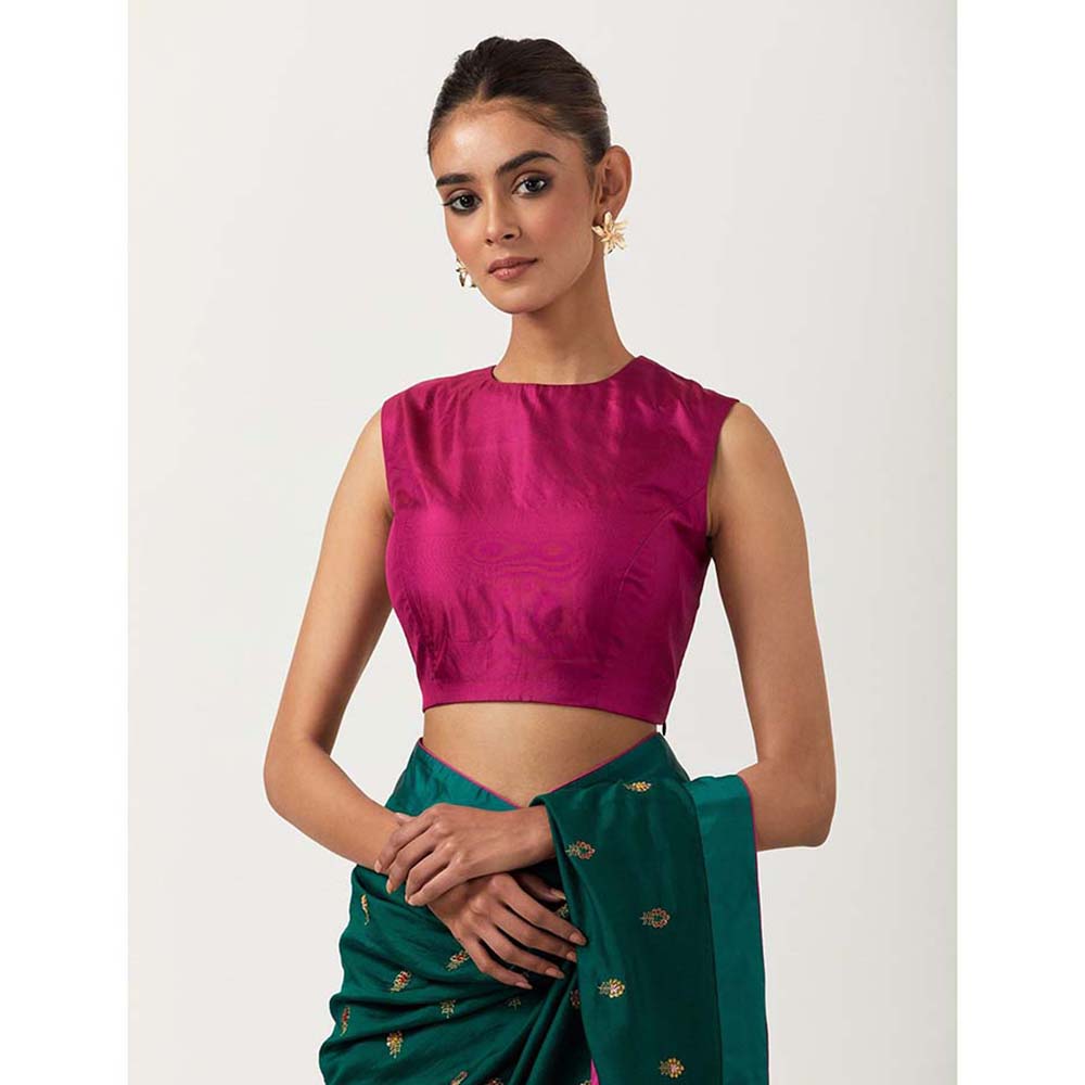 Description : To look beautiful this wedding season, grab this lovely green saree blouse set. It is crafted from premium quality. It features embroidered pattern with sleeveless, round neck style. Pair it with matching jewellery and heels for the gorgeous look.