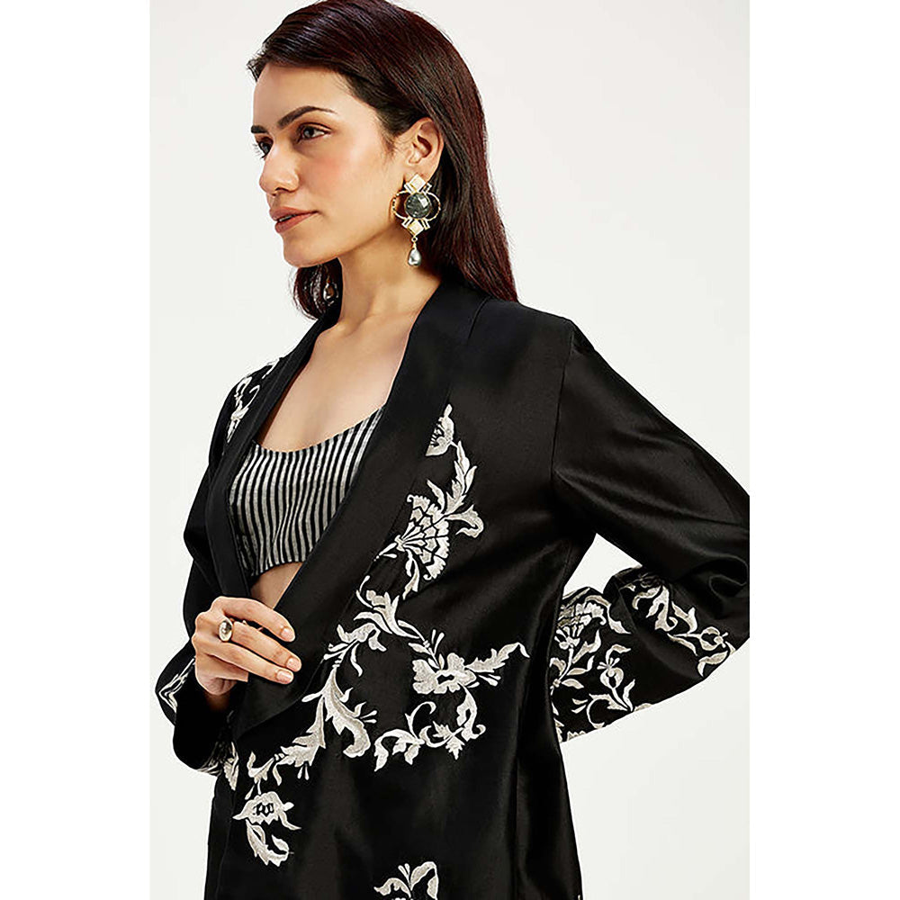 Description : MADDER MUCH Cotton Black Round Neck Embroidered Top With Palazzo And Jacket