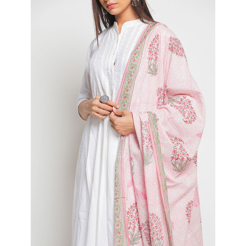 Description : Set of 3 consists of kurta, dupatta and pants set. KURTA- a traditional ghera 36 kali kurta in white, with badla highlights on each kali and finished with crochet lace detailing. Dupatta- Hand block printed dupatta with floral motifs inspired by the mughal gardens and the architecture at the Amer Mahal Jaipur. Pants- straight pants in ivory with stripe print at the hem.