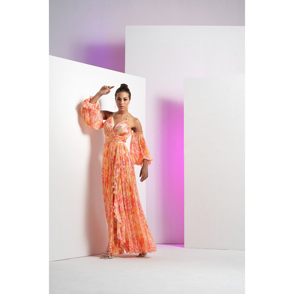 MANDIRA WIRK Orange Pancy Daisy Long Halter Neck Maxi Dress
