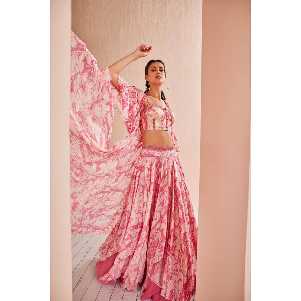 MANDIRA WIRK Printed Chiffon Lehenga Paired Up with Blouse and Cape (Set of 3)