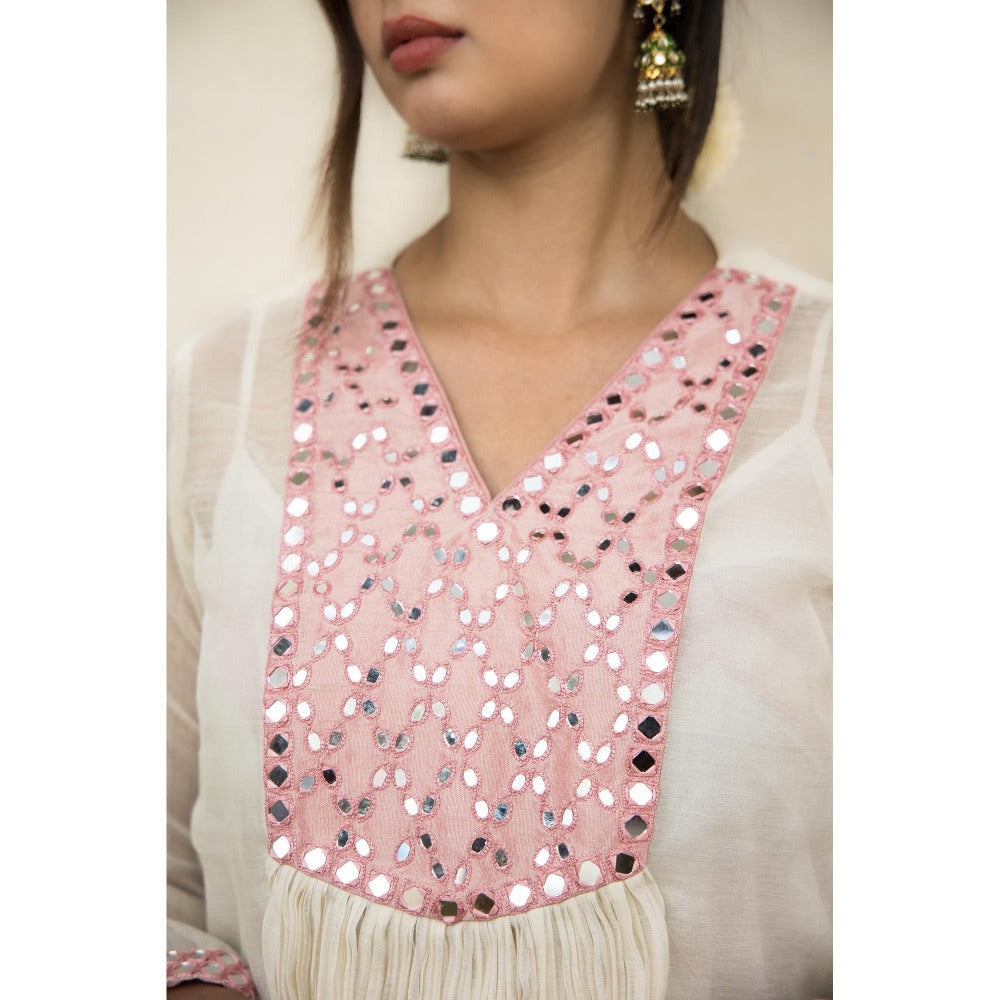 MITHI SUPARI Ivory and Pink Meer Mirror Work Anarkali Kurta with Pant (Set of 2)