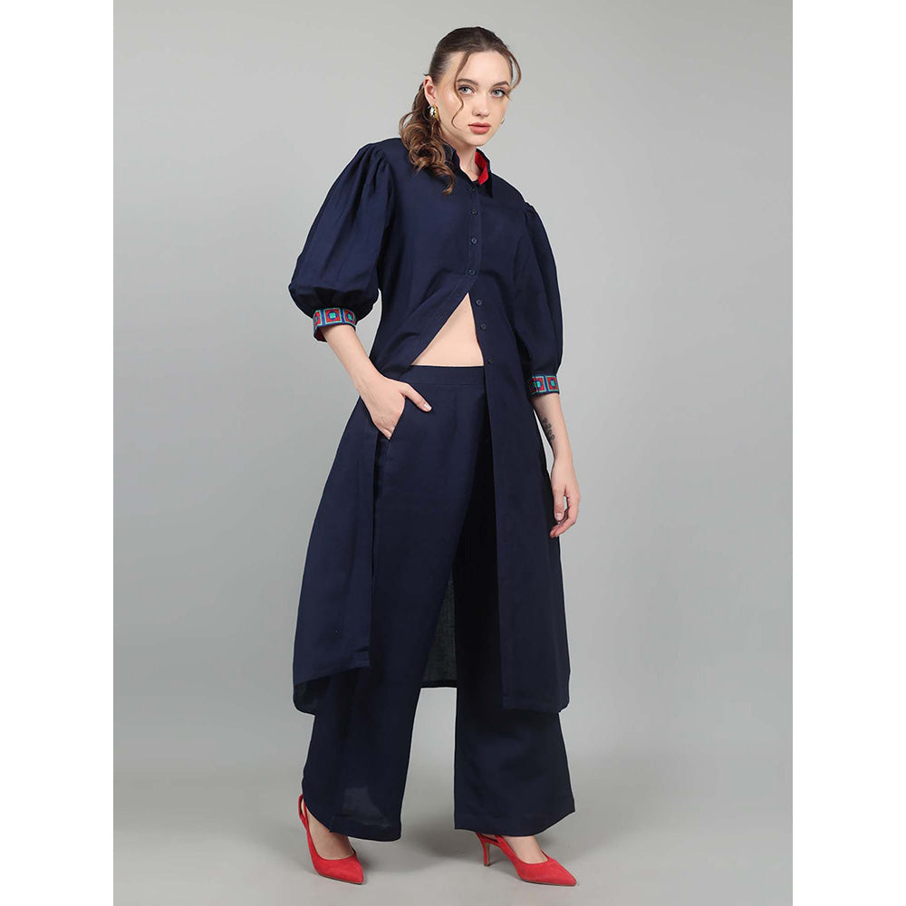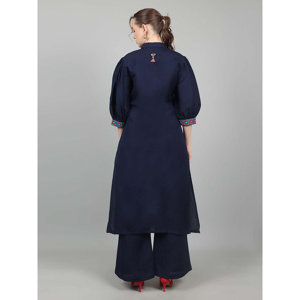 Description : Kurta With Pop Of Red Geometric Embroidery On Balloon Sleeve. A Beautiful Evil Eye And Metal Detailing At The Back .Teamed With Matching Pants