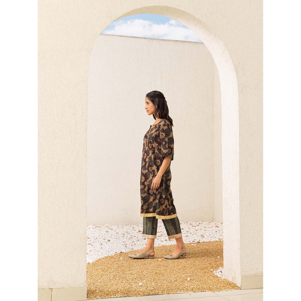 Naseebo Brown Sunflower Serenade Ajrakh Kurta with Pant (Set of 2)
