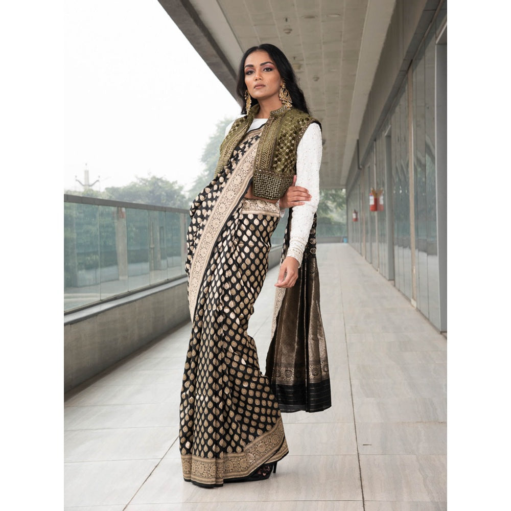 Description : Pure Katan Silk Single Woven Saree. Paired with Ivory Blouse with Embroidered Sleeves & Embroidered Velvet Jacket.