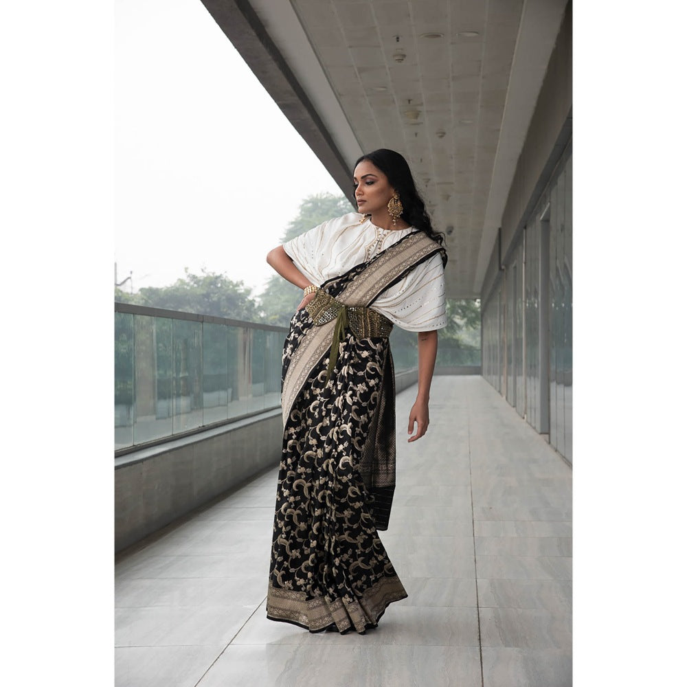 Description : Pure Katan Silk Meenedar Woven Saree. Paired with Ivory Embroidered Cowl Top with Embroidered Velvet Tie-Knot Belt