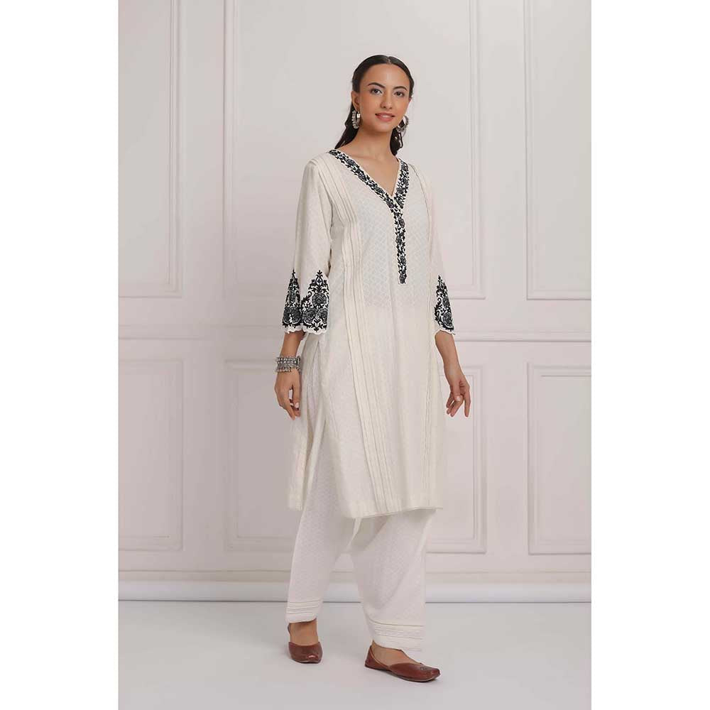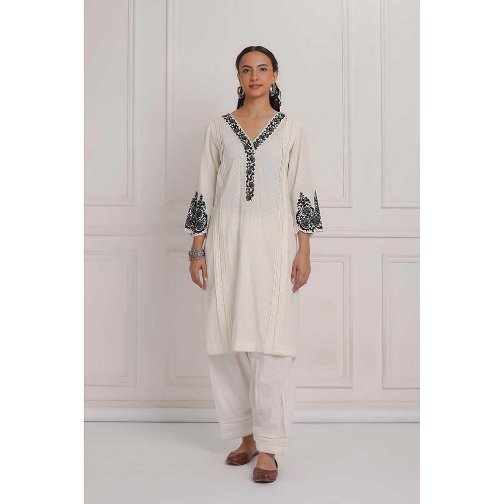 Description : Featuring An Off-White Kurta In Cotton Dobby Fabric With Black Tonal Thread Embroidery Bootas On Sleeve And Lace Detailing. It Is Paired With Matching Salwar Pant.