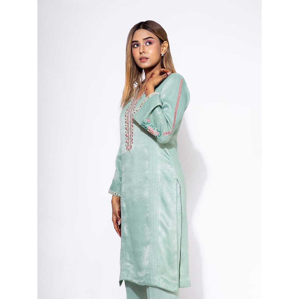 Description : This Blue Kurta And Pant Set, Handcrafted In Moss Satin, Offers A Straight Kurta Featuring Seamline Detailing On The Front Along With A Delicate Mirror And Thread Embroidery Neckline, As Well As Delicate Mirror And Thread Embroidery Boota On The Sleeve As Well As A Border Of Seamline And Embroidery Border On The Sleeve And Hem Of The Pant. Pair It With An Elegant Scalloped Organza Dupatta With All-Over Floral Booti Embroidery To Give A Traditional Look.