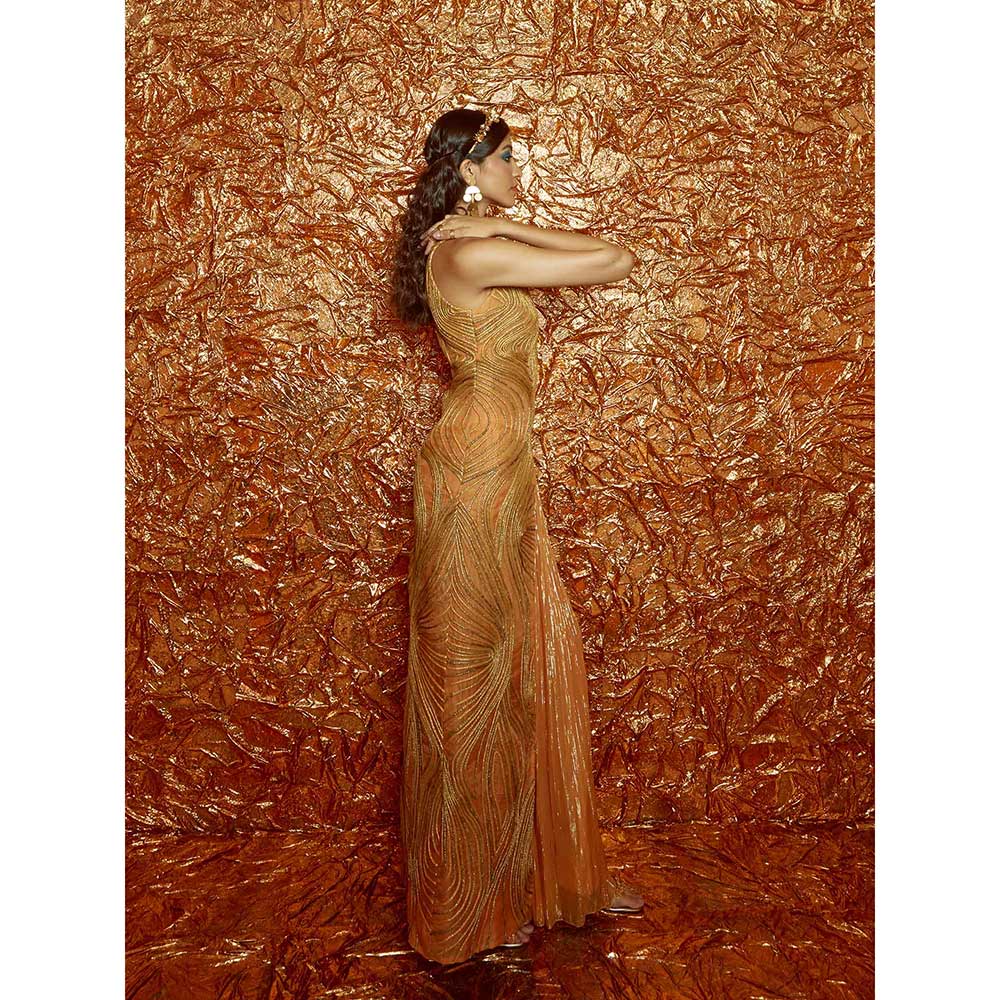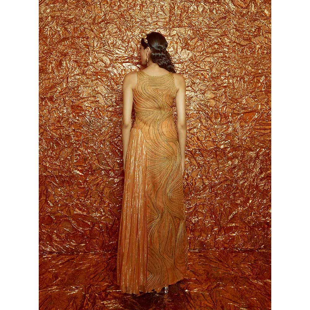 Description : Assymetrical Mustard Organza Kurti with Cording detailing and Lurex Sharara
