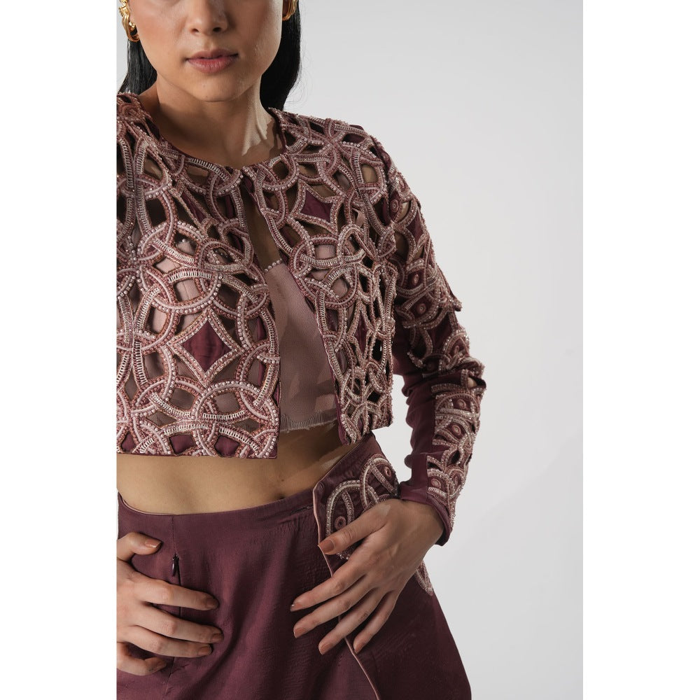 Mauve Cutwork Intricate Self Design Cropped Jacket