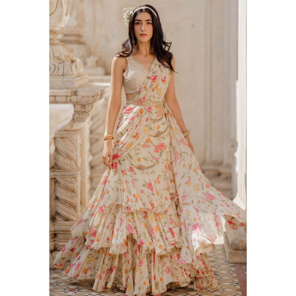 Paulmi & Harsh Ivory Three Layered Pre-Stitched Saree with Blouse (Set of 3)