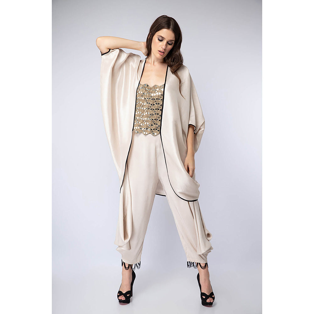 Description : Stone Silk Kaftan with Black Mirror Work Embroidered Yoke and Black Piping All Over with Stone Silk Calf Length Cowl Pants with Bead Scallops At The Hem. Please Note: Top Is Free Size and Bottom Will Be As Per The Standard Size Guide Provided.