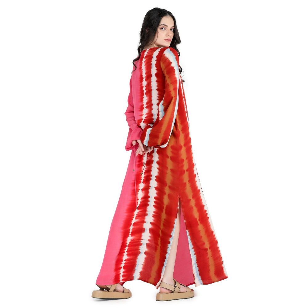 Description : Elevate your style with this multi-color margengta tie and dye embroidery kaftan maxi dress from Pinnacle By Shruti Sancheti. Made from high-quality viscose, this piece features full sleeves and a round neck. Style it with minimal jewellery and sandals to complete the ensemble.