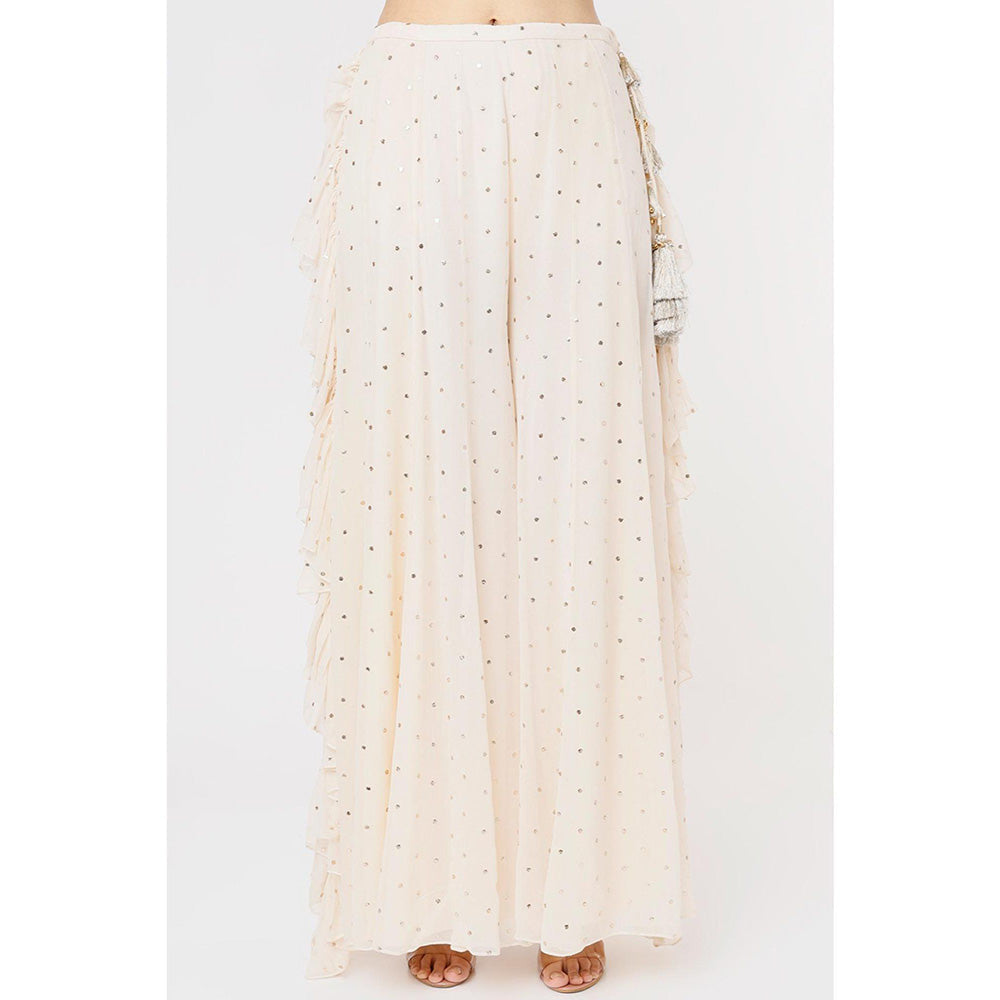Description : Embrace elegance by stepping out in this captivating off white embroidered yoke with bandhani bustier & frill sharara from PS Pret by Payal Singhal. Made from high-quality georgette, this piece features a sleeveless design and a round neck. Style it with minimal jewellery and sandals to complete the ensemble.