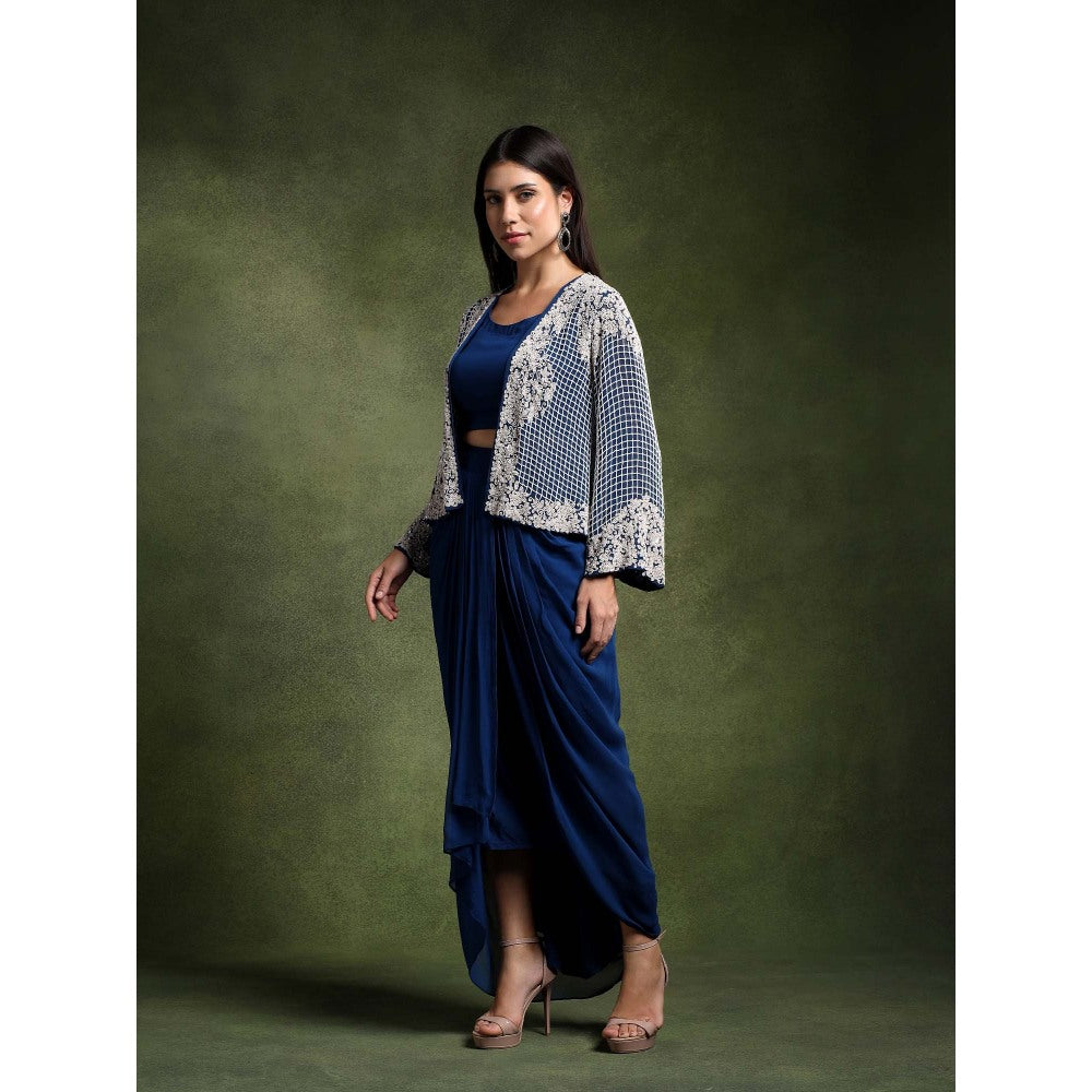 Description : Blue Hand Embellished Jacket With Blue Cowl Drape And Corset