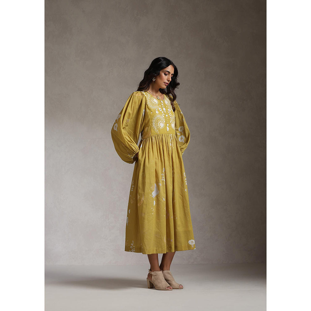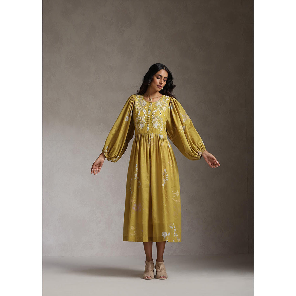 Description : The Dress Is Crafted Out Of Cotton Mul and Comes In An Anti-Fit Silhouette. It Has An Elasticated Back Waist That Adds A Feminine Touch To The Style and Some Extra Comfort. The Hand Embroidery On The Yoke Is The Highlight.