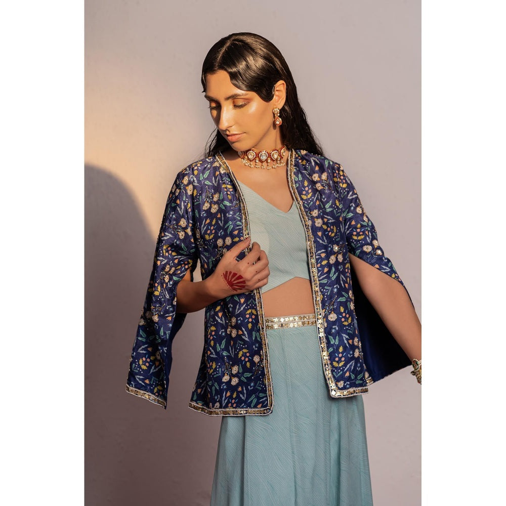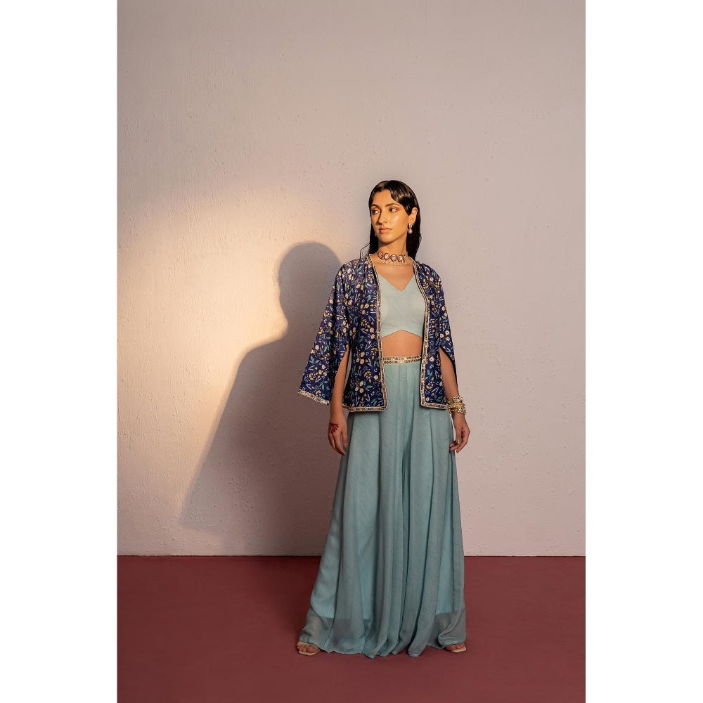 Redpine Designs Royal Blue Printed, Embroidered Cape with Palazzo and Bustier (Set of 3)