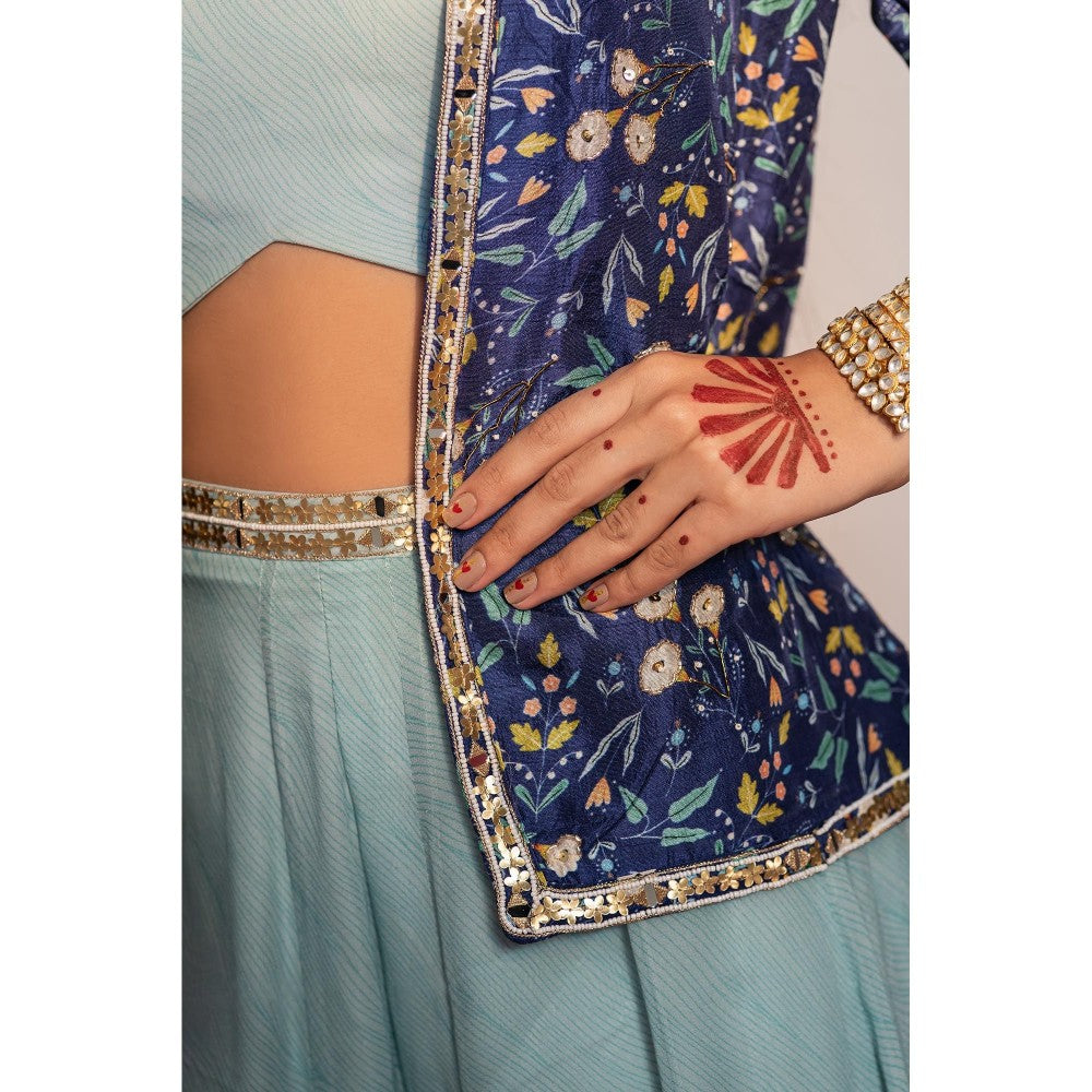 Description : Featuring A Royal Blue Cape & Palazzo In Viscose Raw Silk Base With Kasab, Cut dana, Flower Sequin, Mirror And Moti Hand Embroidery. It Is Paired With A Matching Embroidered & Printed Viscose Georgette Kali Palazzo & Bustier.