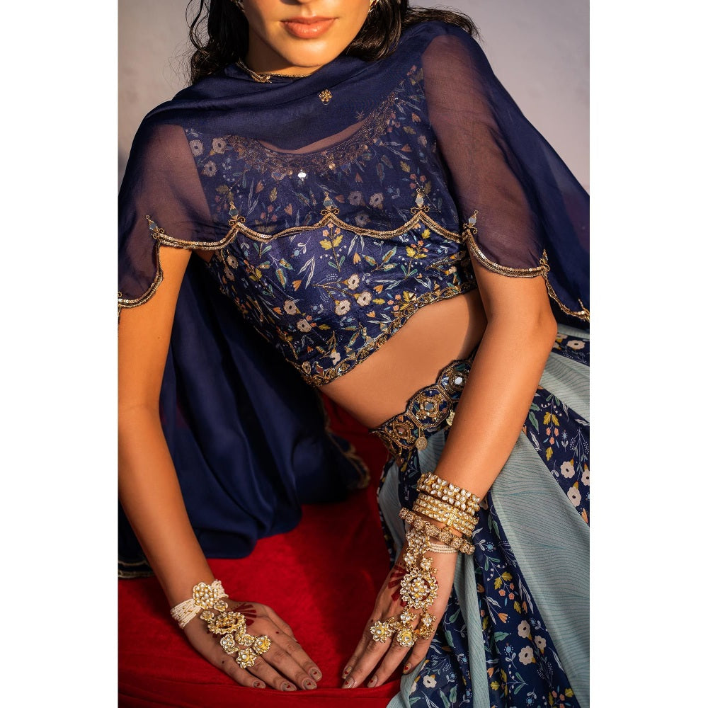 Royal Blue Printed Lehenga with Blouse, Belt and Dupatta (Set of 4)