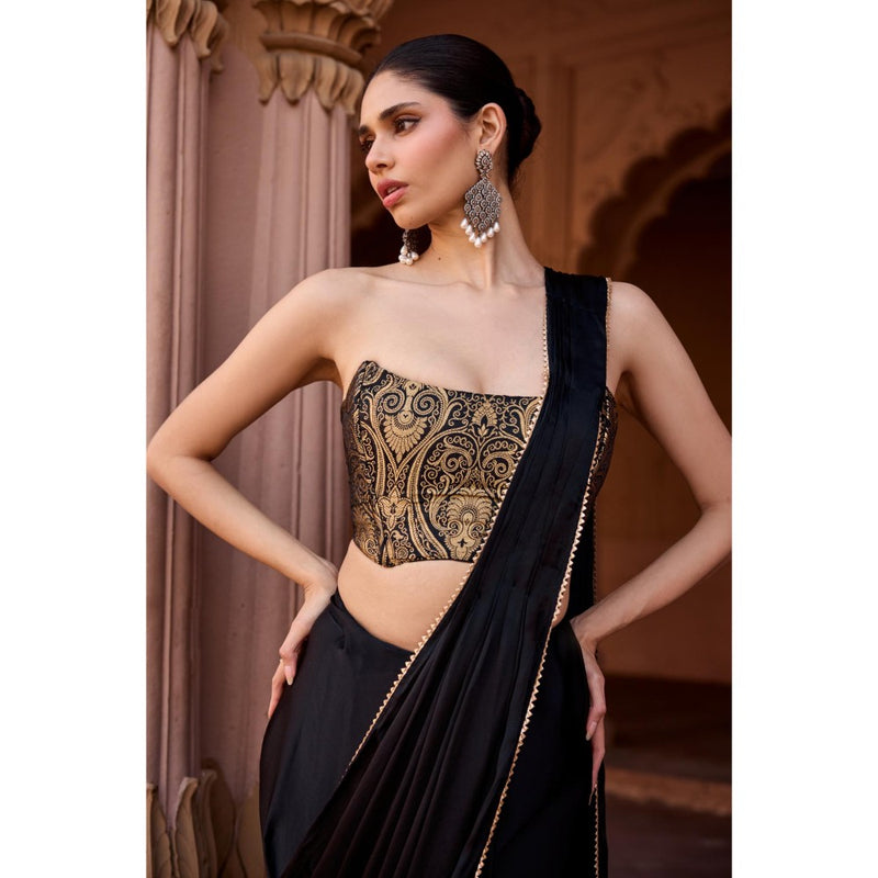 Description : The kanza black + gold pre-stitched saree is your shortcut to looking like a goddess-minus the struggle. Made with the softest black Armani satin, this saree drapes like a dream, while the gold-detailed edges add just the right amount of opulence. And let's talk about that blouse-crafted from luxurious black and gold brocade, it's a masterpiece in itself. Designed in a structured tube silhouette, the blouse features our signature boned corsetry for that sculpted, snatched look. The metallic zipper closure at the back makes slipping into this ensemble a breeze-because who has time for complicated hooks and ties? Made with softest black Armani satin; premium black and gold brocade fabric for the blouse. Saree with gold details at the edges. Pre-draped silhouette. Tube silhouette blouse. Signature boned corsetry. Metallic zipper closure at the back. Styling tip: go all out with golden statement earrings and a sleek, high bun to let the saree shine. Or, throw on some edgy heels and a bold lip for a modern, power-packed vibe. Either way, you're about to turn heads!