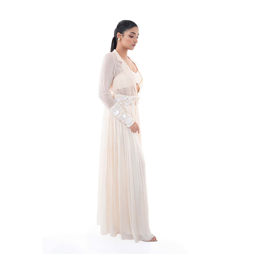 Description : Set Of Bustier And Flared Pants Paired With Organza Shirt Which Has Cone Shaped Sequins And Crystals Work Patches On The Sleeves
