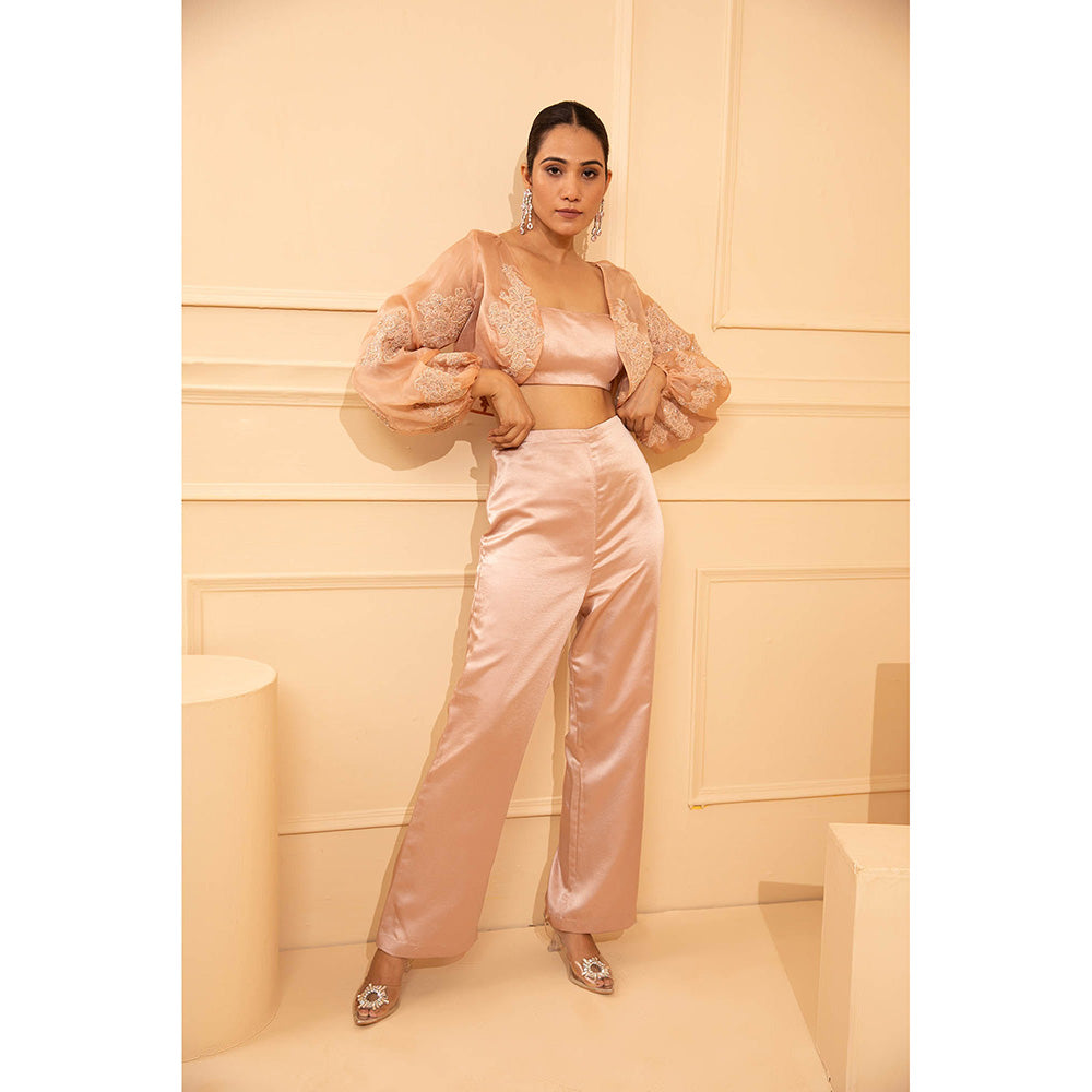 Description : Get party-ready with this pink jacket with bustier and pant (set of 3) from Shriya Dahlia. Crafted from organza, this beautiful set is finished with puff sleeves and a square neck. Style it with a pair of heels and minimalistic jewellery pieces.