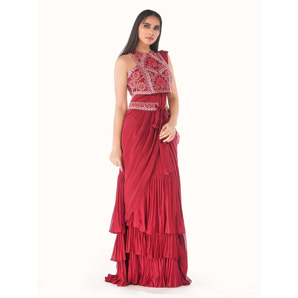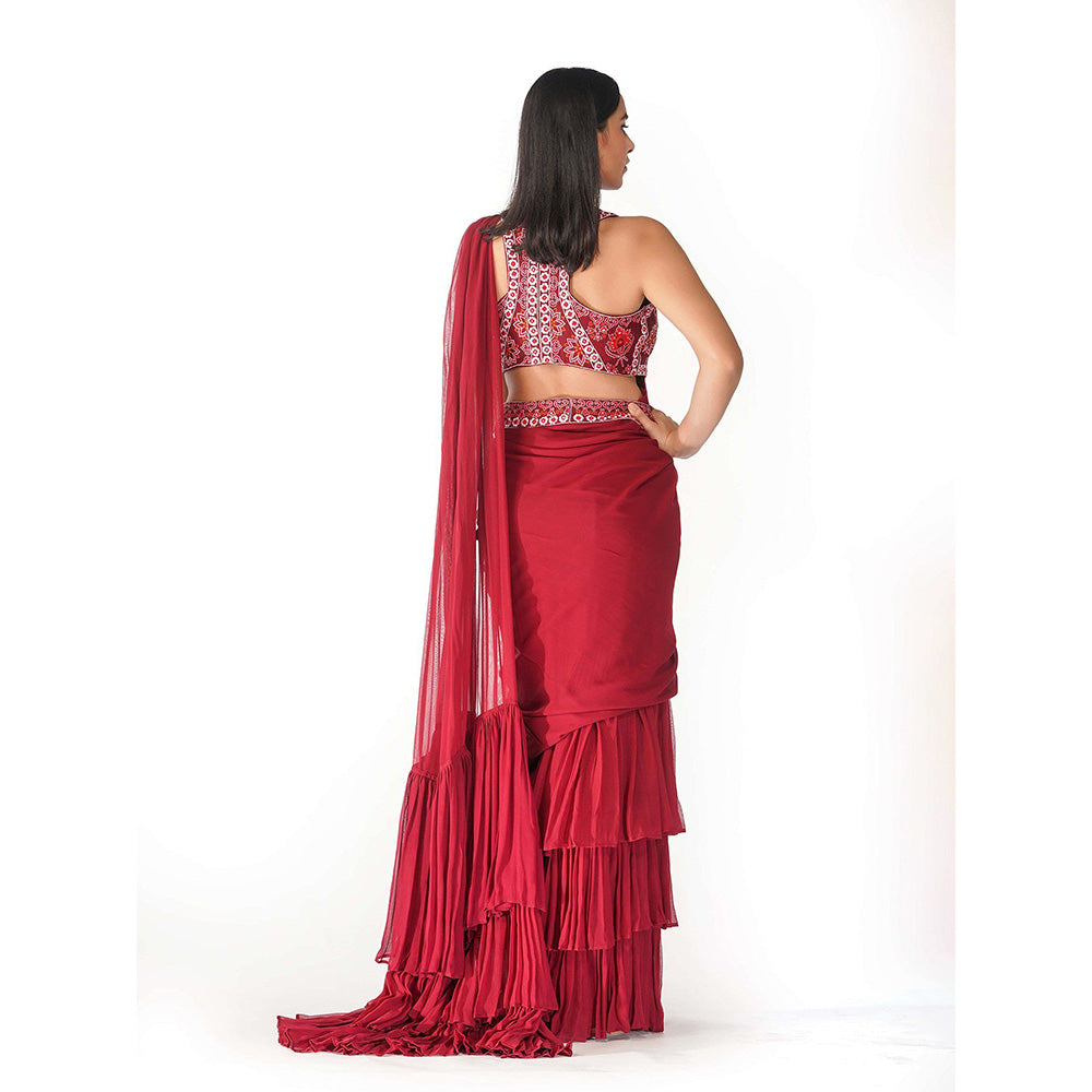 Shruti S Red Ruffle Draped Saree with Stitched Blouse