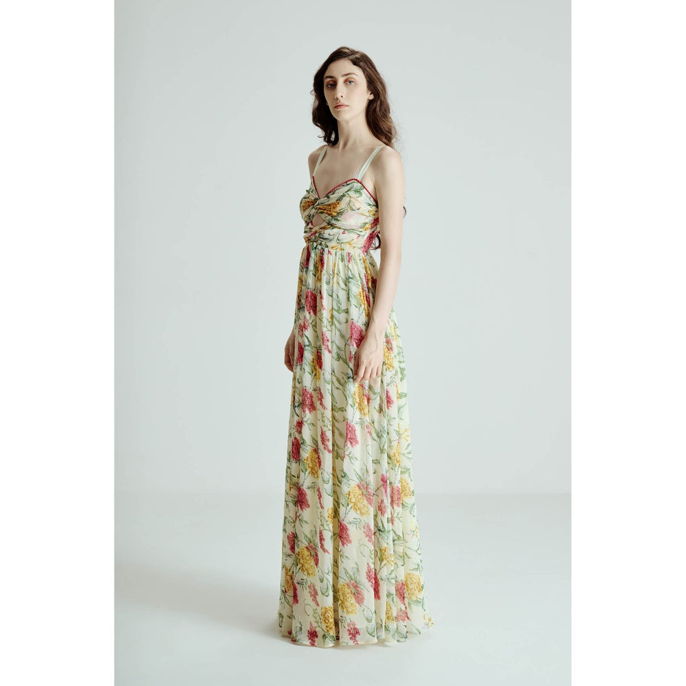 Description : Long Dress With A Light Floral Print, Featuring Spaghetti Straps, A Twisted Knot Detail On The Bust, And A Cut-Out Design At The Waist. Designed With A Flowy Fabric Best For Summer.