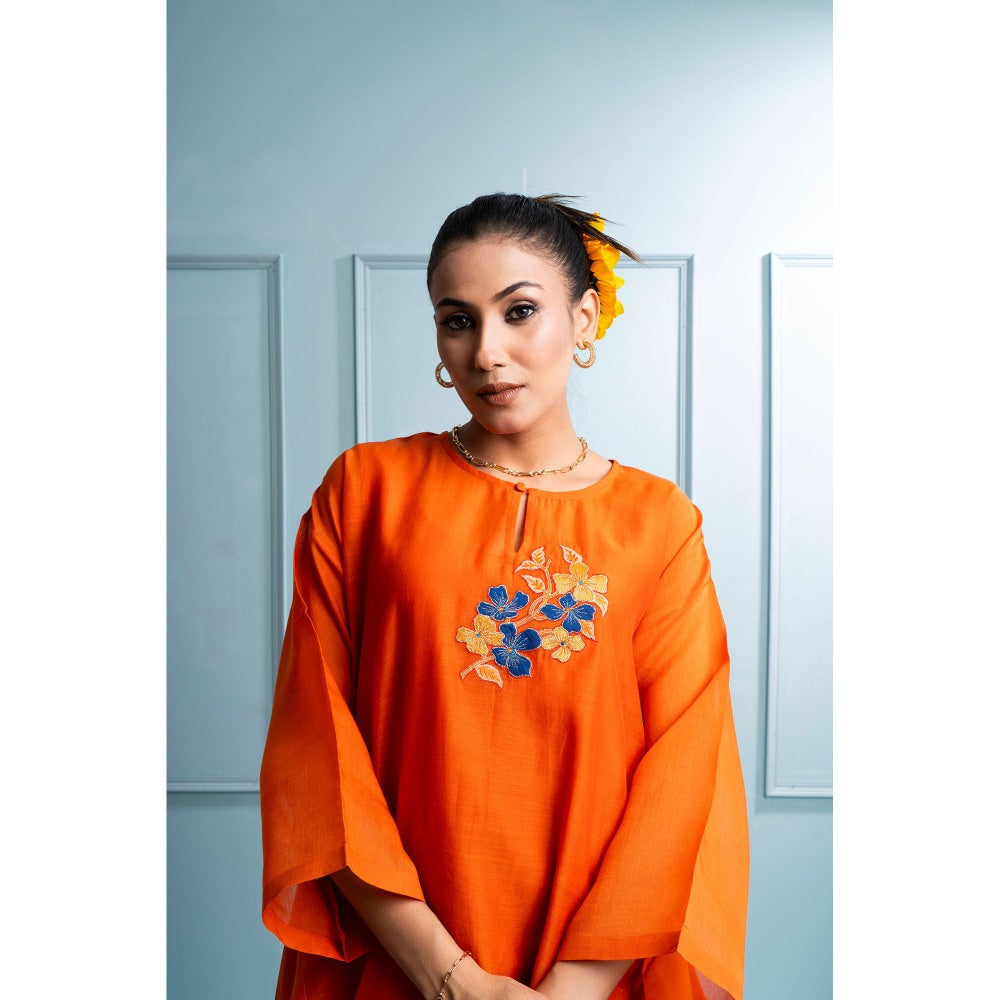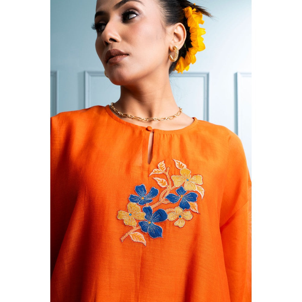 Description : Orange Asymmetrical Kurti Features A Flowy Asymmetrical Hemline with Voluminous Side Panels. The Centrepiece Is A Stunning Applique Floral Spray, Highlighted with Shimmering Gold Zari and Badla. Paired with Mul Chanderi Lowers, Adorned with Intricate Butties and An Embroidered Hemline, Lined with Soft Mul Cotton For Ultimate Comfort. It Also Comes with A Separate Mul Cotton Slip.