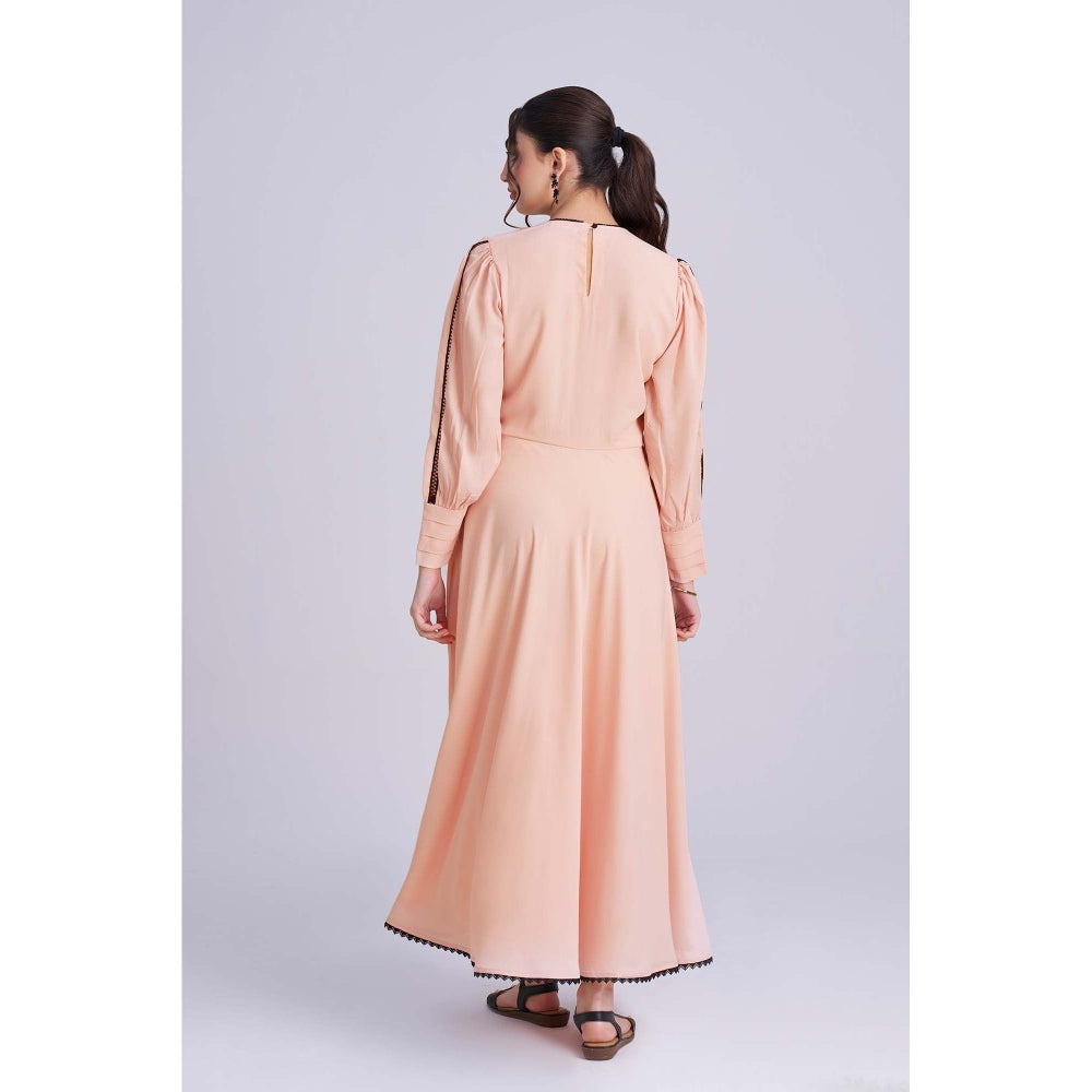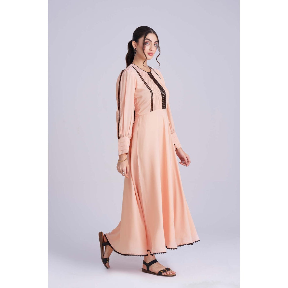 Description : This Peach Georgette Maxi Dress Features Elegant Full Sleeves And Delicate Black Lace Inserts On The Bodice For A Striking Contrast. The Umbrella Flare Skirt Adds Graceful Movement, Making It A Perfect Blend Of Charm And Sophistication.