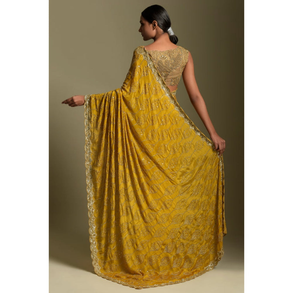 Presenting a chinon-based saree in a bright mustard hue, adorned with exquisite sequins, sparkling Swarovski crystals, and gleaming gold moti embroidery. This full jaal saree comes with a matching unstitched satin blouse, also intricately embroidered in the same jaal pattern on both the front and back.
