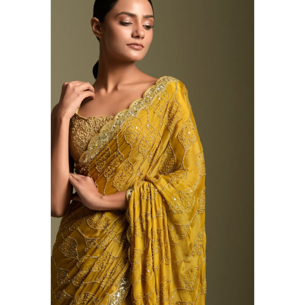 "Two Sisters" by Gyans Mustard Chiffon Embroidered Pre-draped Saree with Unstitched Blouse