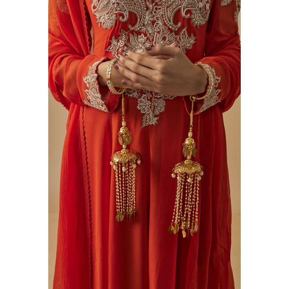 Description : Exquisite gold-toned wedding kaleere with intricate detailing, pearl strands, and leaf charms. A stunning bridal accessory symbolizing blessings, elegance, and tradition for your special day.