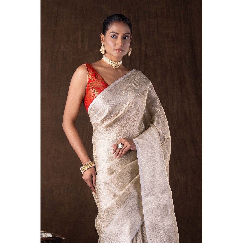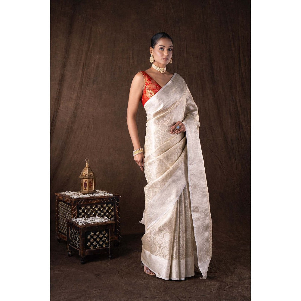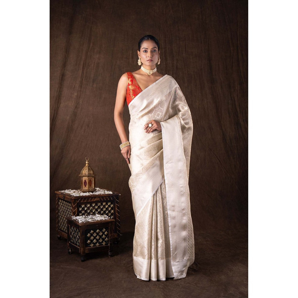 Zal from Benaras White Pure Katan Silk Brocade Banarasi Handloom Saree without Blouse