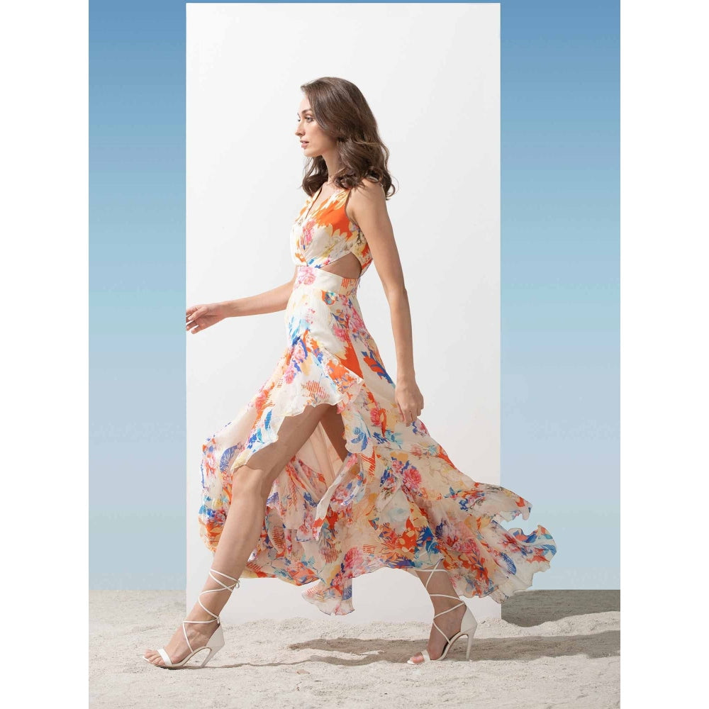 Description : Chiffon printed overlaped neckline dress with cut outs at waist and asymmetric bottom with frills