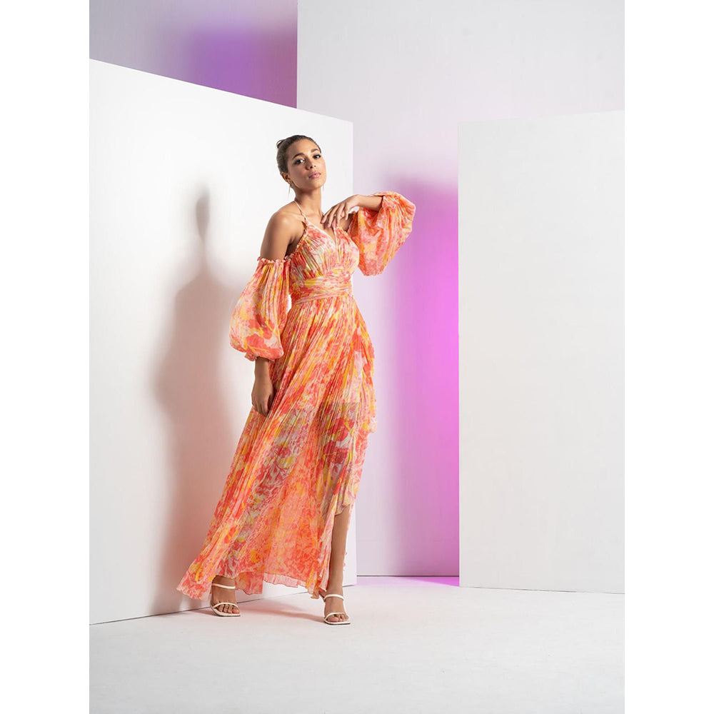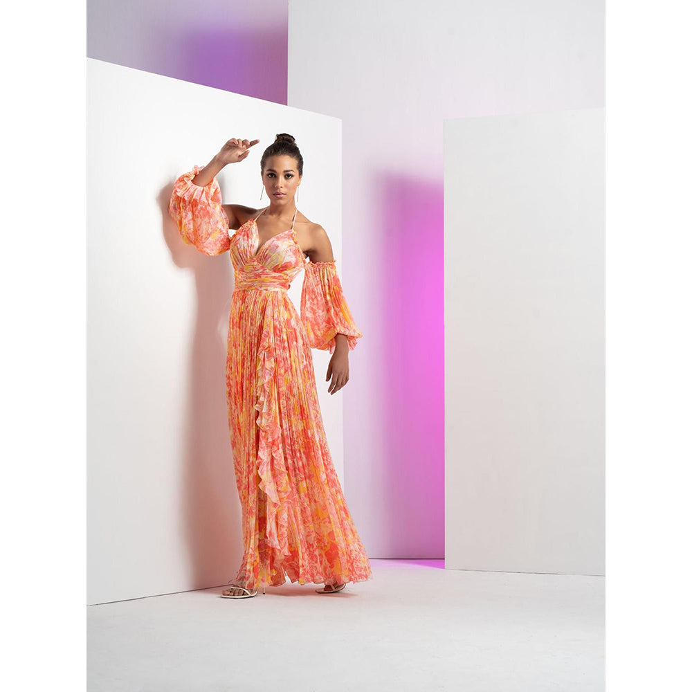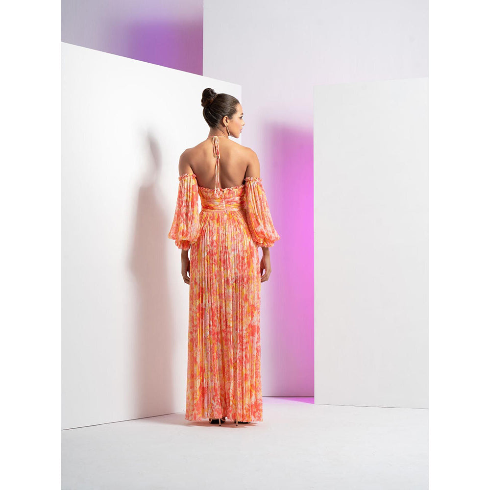 MANDIRA WIRK Red Pancy Daisy Long Halter Neck Dress
