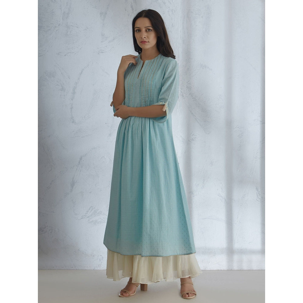 Mandira Wirk Blue Kurta With Pin Tuck Detailing And Ivory Tiered Sharara (Set of 2)