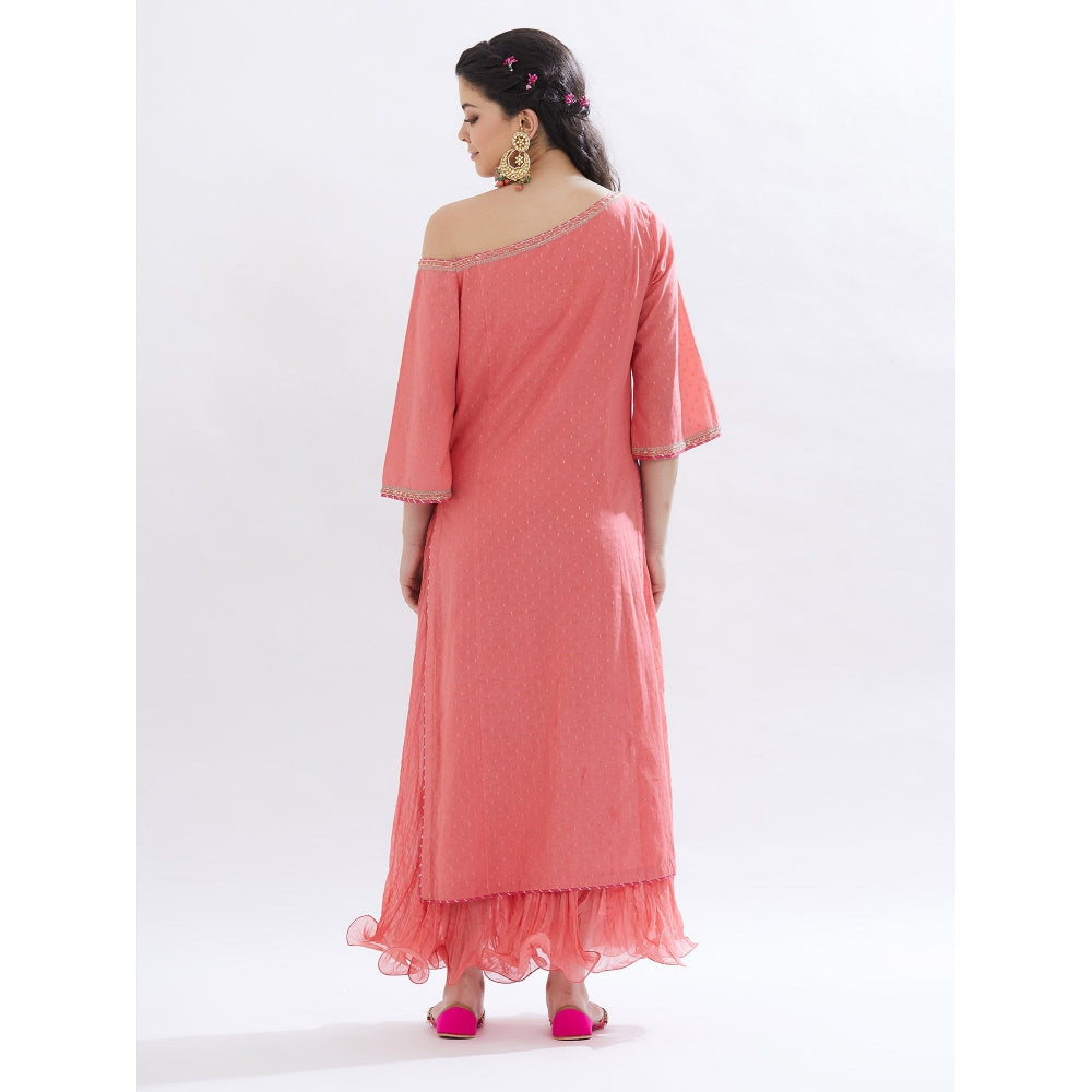 Description : Add a spot of stylish joy to your festivities with our embroidered coral lurex cotton kurta paired with a hand foil printed dupatta.