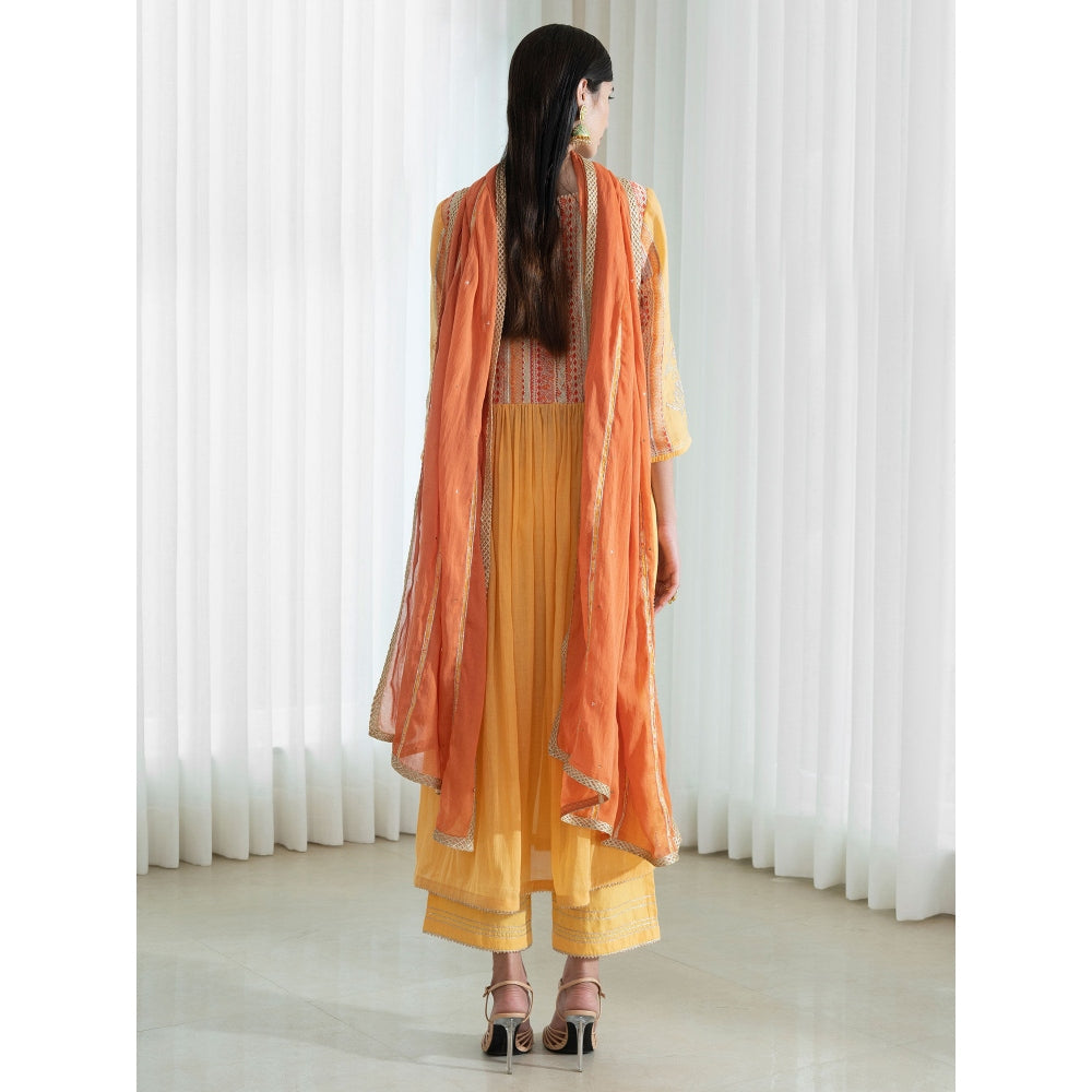 Description : Mustard printed and highlighted yoked kurta with slits paired with solid gota detail pants and organza cutwork dupatta
