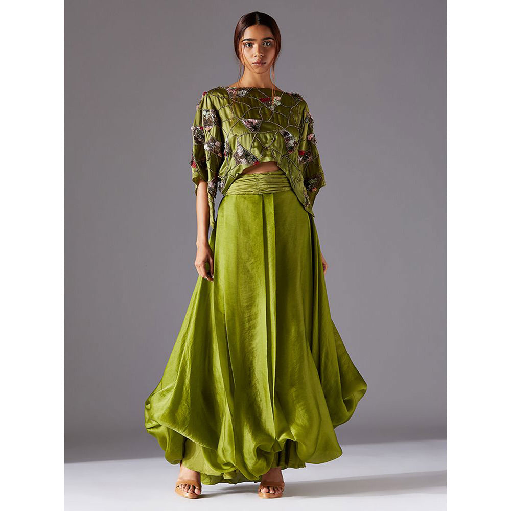 Description : This crop top which is made in bamberg satin has a boat neck, curved hemline and curved sleeves. it also features our signature landscape jacobean handwork all over the top.