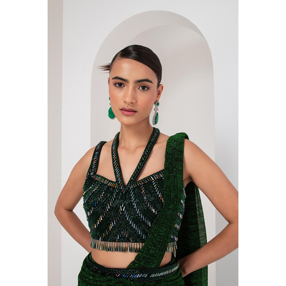 Women's Green Embellished Pre Drape Saree with Stitched Blouse & Belt