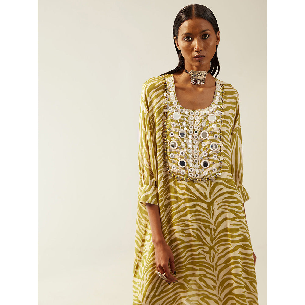 Description : Kasara contemporary Kaftan Kurta set is inspired by rajasthan's domestic surrounding and precise wrap of handmade sheeesha flatlay, The set can be worn as your second skin for a casual weekend wedding shenanigans.